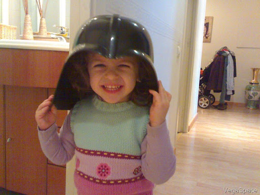 Que grande tienes un casco oscuro jajaja. Y se lo pones a tu hija. Cuidado que el lado oscuro ya ha entrado en tu casa, pronto se te formará un pequeño imperio.